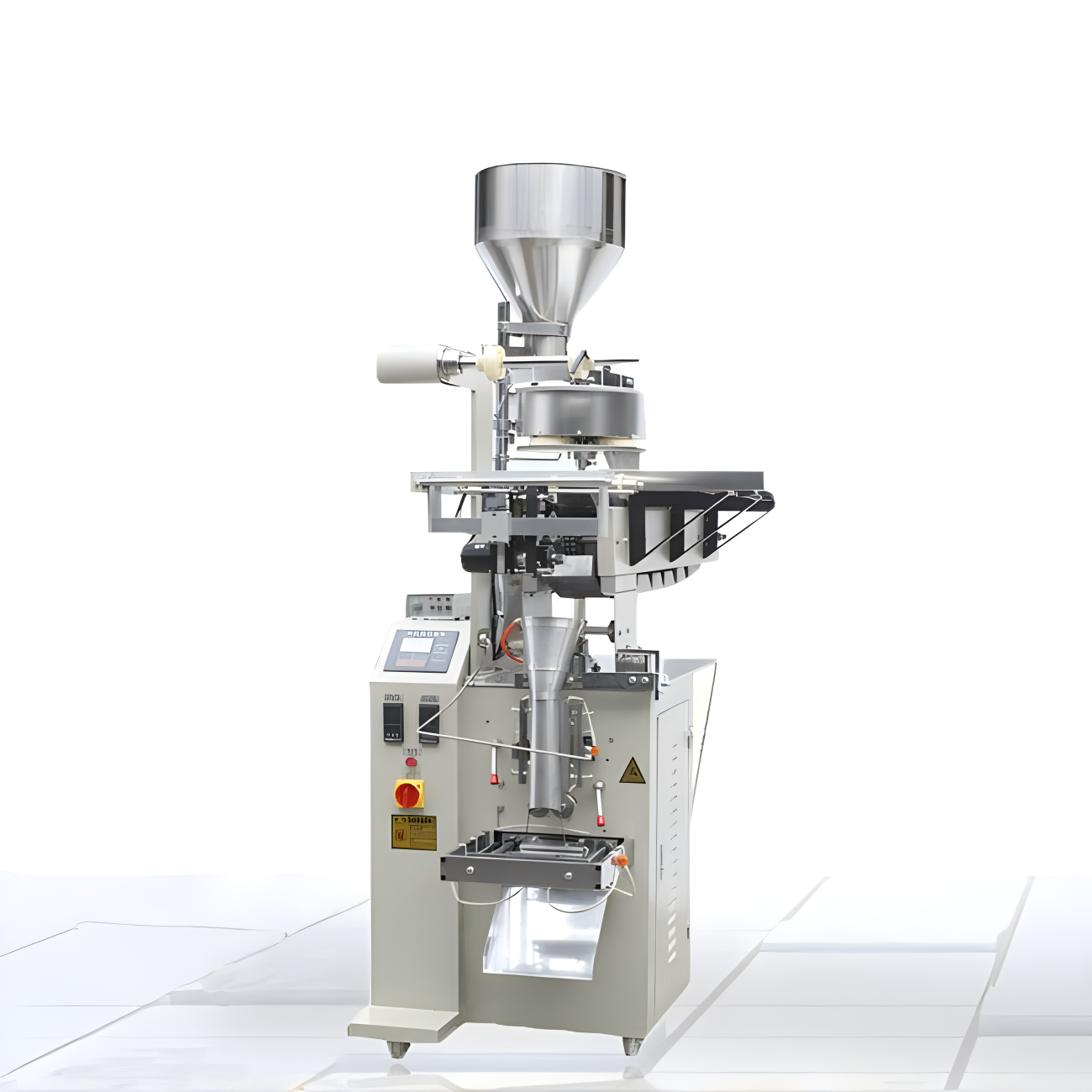 包裝機(jī)自動啟動加料螺旋向口袋中進(jìn)行快加料,在加料過程中,稱重儀表連續(xù)檢測袋中物料的重量,當(dāng)快加料到包裝中物料的重量達(dá)到人工在儀表上設(shè)定的快加量時,快加量結(jié)束,包裝機(jī)自動停止快加料,包裝機(jī)掛袋機(jī)構(gòu)開始下降至托盤上開始第一次震袋,使物料在袋內(nèi)散開,增加物料堆積密度,然后掛袋機(jī)構(gòu)自動上升恢復(fù)至原位。